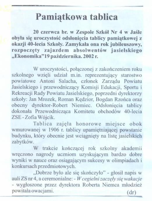 Przypadający w 2002 r. Jubileusz 40-lecia działalności ZSE w Jaśle jest doskonałą okazją, by przypomnieć wydarzenia i osoby, związane ze szkołą, o których zawsze starałem się mówić dobrze i z życzliwością, pamiętając przede wszystkim to, co wydarzyło się między 1991 a 1997 rokiem.